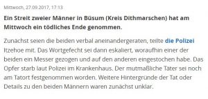 Büsum (ots) – Am 27.09.2017, gegen 14:30 Uhr gerieten in Büsum zwei männlichen Personen mit Migrationshintergrund zunächst in einen heftigen Streit, der nach kurzer Zeit eskalierte. Im Verlauf dieses Streites zog einer der beiden Beteiligten ein Messer und verletzte seinen Kontrahenten schwer.